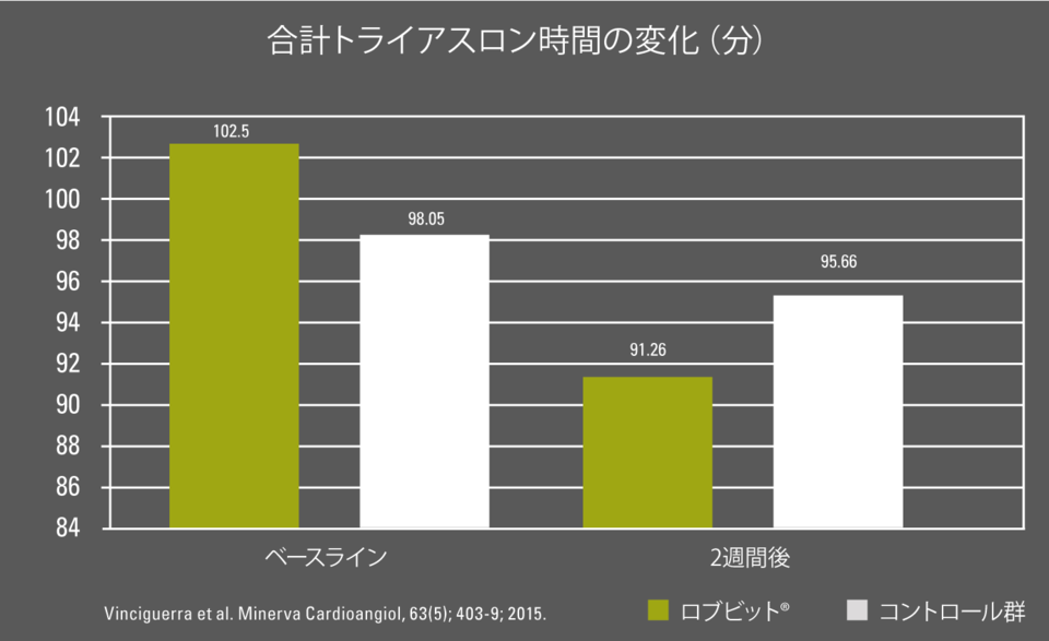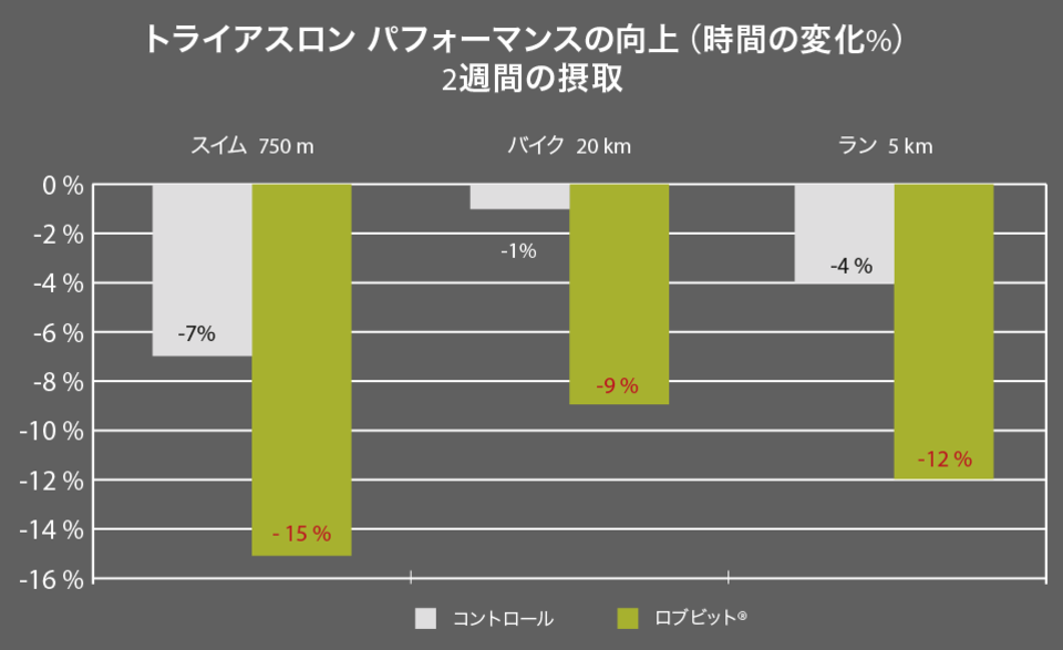 全体的に、2週間ロブビット®の摂取によるパフォーマンスの向上により、コントロール群に比べ、トライアスロンの合計時間が大幅に10.6%改善されました。レース中の環境要因などもありますが、このような改善により、トライアスロン選手中の遅い25%から上位25%まで上昇する可能性があります。