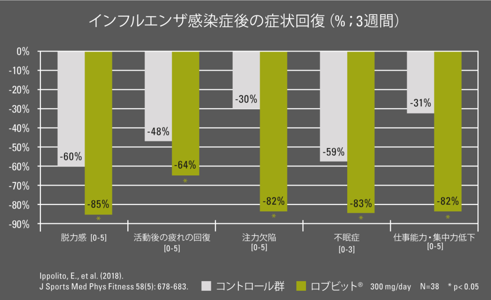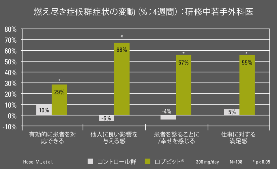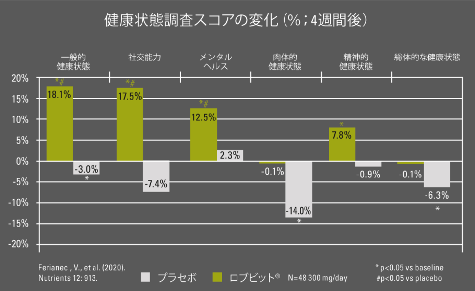子宮摘出手術は女性の子宮を切除するための外科的処置です。女性特有の疾患などの医学的適応に応じて行われる手術であり、術前の症状などが改善することが見られますが、術後の回復期間に脱力感、頭痛、吐き気、痛みやうつ症状といった生活の質の悪化も見られます。最近報告された二重盲検プラセボ比較パイロット臨床試験で、ロブビット®の摂取で、術後の回復の有意な改善や酸化ストレスの軽減が確認された。4週間のロブビット®(300mg/日)の摂取により、総体的な健康状態とメンタルヘルスが有意に改善したが、プラセボ群では有意な改善が見られませんでした。プラセボに比較、ロブビットの摂取で酸化ストレス並びに炎症酵素であるMMP-9の活性が抑制された(抗炎症効果)。
